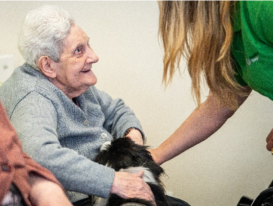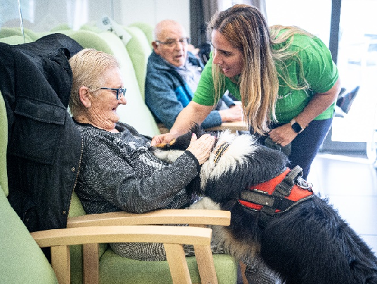 La teràpia canina, implica la visita regular de gossos entrenats, en el nostre cas, amb la Nola, al nostre centre residencial. La Nola, juntament amb Jessica, que es l’educadora social, interactuen amb els residents a través d’activitats com carícies, jocs i trucs. La presència dels animals proporciona una font constant d’alegria i ajuda a reduir els sentiments de solitud i depressió que sovint afecten la gent gran.